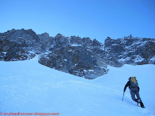 Today I went up there to climb one of the classic gullies together with my friend Andrew Lanham. We went up with the first bin and walked over to the Eugster couloir and followed this for a couple of hundred meters before we traversed right to Carli-Chassagne gully a bit further lookers right.